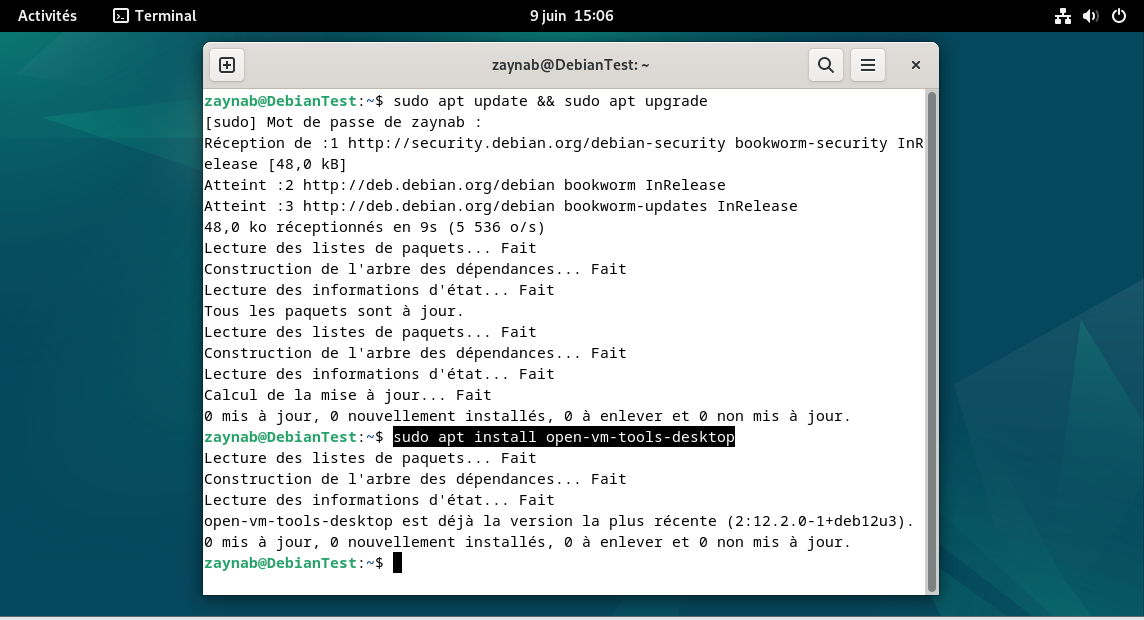 2. Une fois les paquets mis à jour, nous procédons à l’installation des outils VMware en tapant la commande : sudo apt install open-vm-tools-desktop
